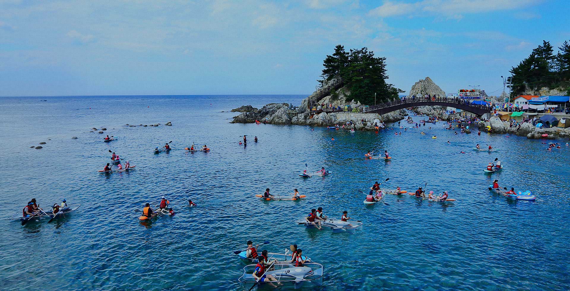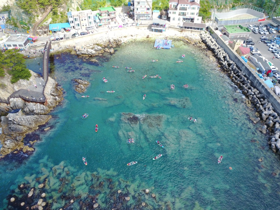 장호항 바다는 바닥이 육안으로도 훤히 보일 정도로 맑은 에메랄드빛으로도 유명한 곳이라, 스노클링을 즐기는 분들도 많이 찾고 있는 인기 여행지 중 하나입니다. 장호항에서 유명한 또 다른 레포츠는 '투명카누'입니다.